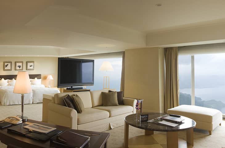 ベージュで統一された室内は、暖かさとやさしさに包まれています。窓から望む遥かなる稜線と洞爺湖や内浦湾の美しさはもちろん、ゆったりとしたスペースに設置されたスタイリッシュな家具と照明によって醸しだされる上質なアロマを、ぜひ体験してください。