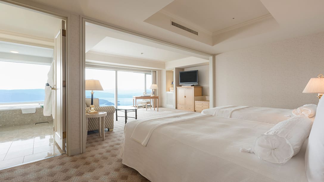 連泊に快適な58m2のくつろぎの空間。バスルームにもこだわり、全室にシャワーブースと液晶テレビを設けました。ビューバスタイプのお部屋では眼下に広がる洞爺湖を眺めながら、その他のお部屋ではベッドルーム横に配された遊び心あるレイアウトで、くつろぎのバスタイムをお楽しみいただけます。
