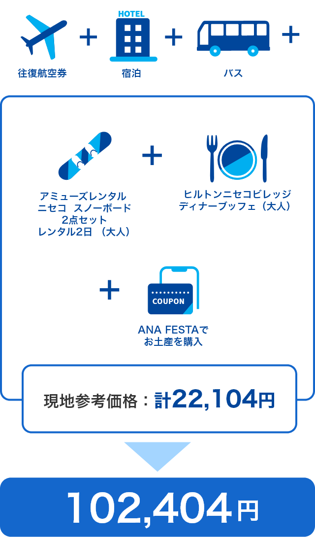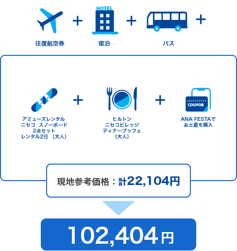 1泊ずつ異なる宿泊施設を予約したり、スキーバス・ANAスキーリゾートチケットを一緒に予約することも可能です。