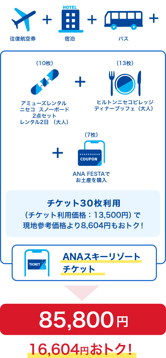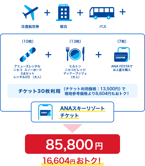 リフト・ゴンドラ券はもちろん、スキー&スノーボードレンタルやウェアレンタルがおトクに使える電子チケットです。余っても新千歳空港・旭川空港内のANA FESTAで利用できるので、お土産にも使えて便利!