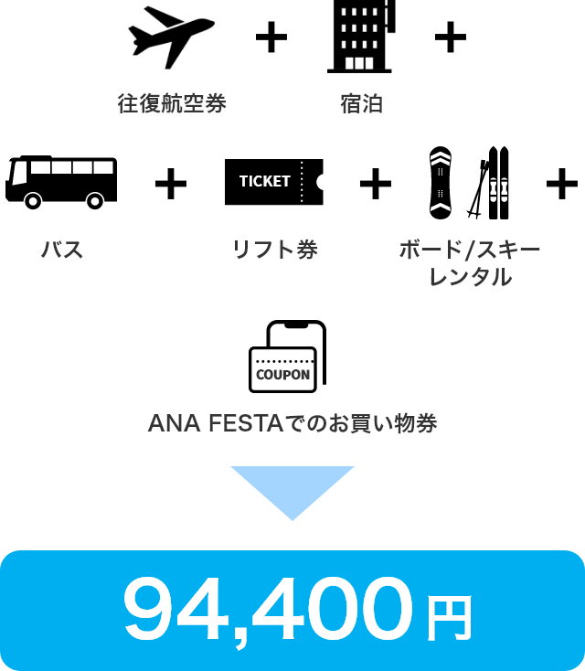 リフト・ゴンドラ券はもちろん、スキー&スノーボードレンタルやウェアレンタルがおトクに使える電子チケットです。あまっても新千歳空港内のANAFESTAで利用できるので、お土産にも使えて便利!