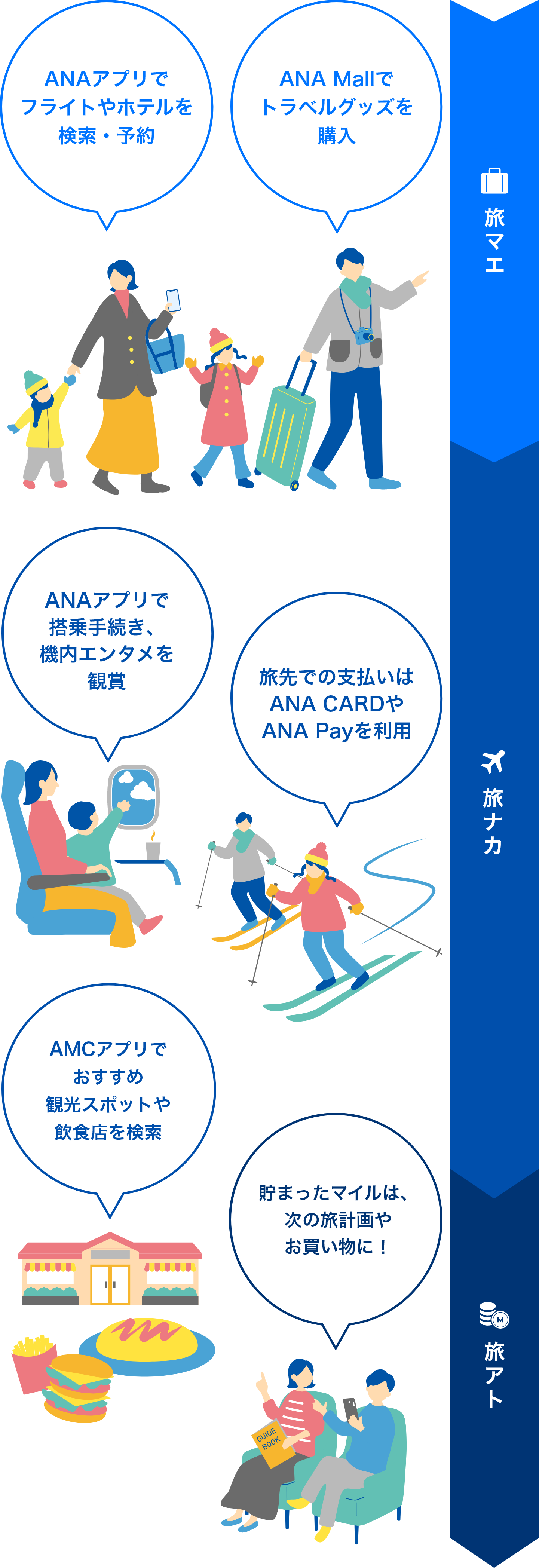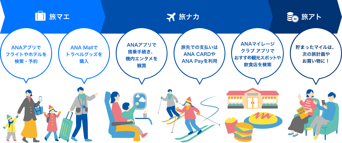 2種のアプリ、ANA Pay、ショッピングなど、旅の計画(旅マエ)から旅が終わった後(旅アト)