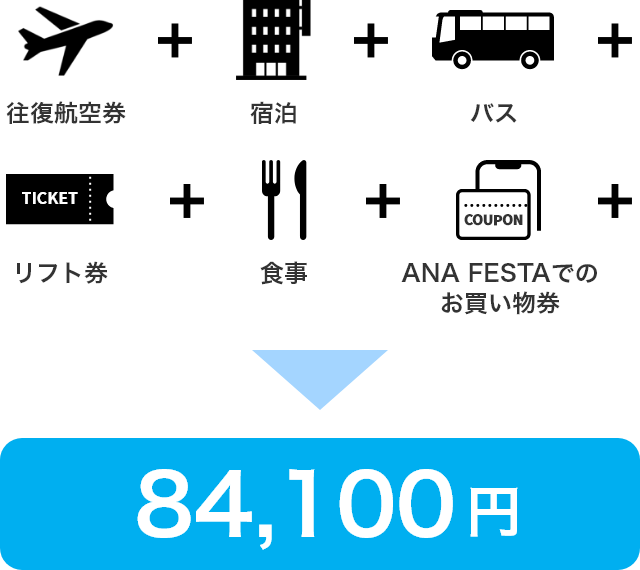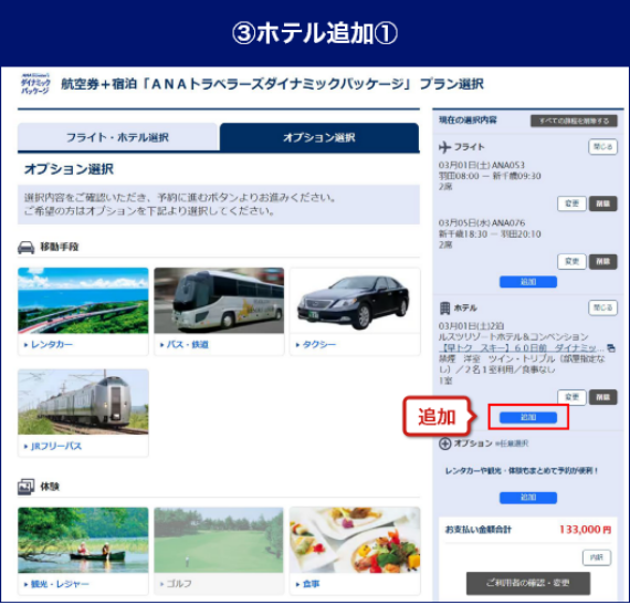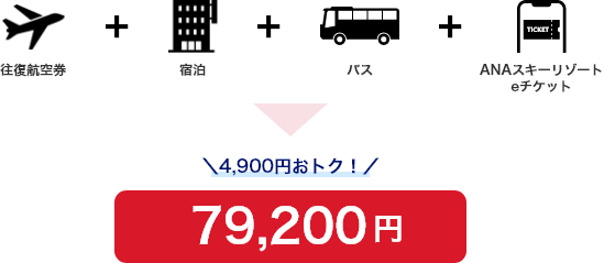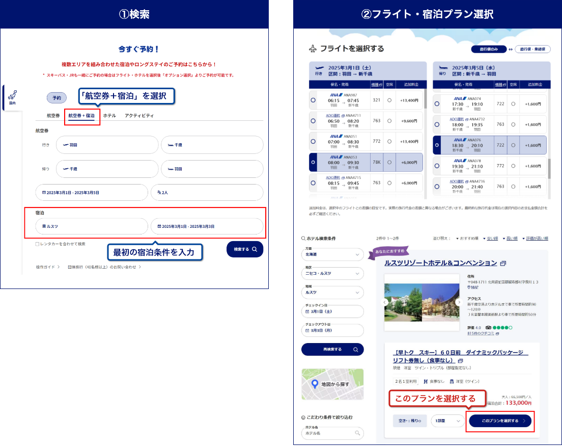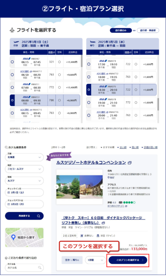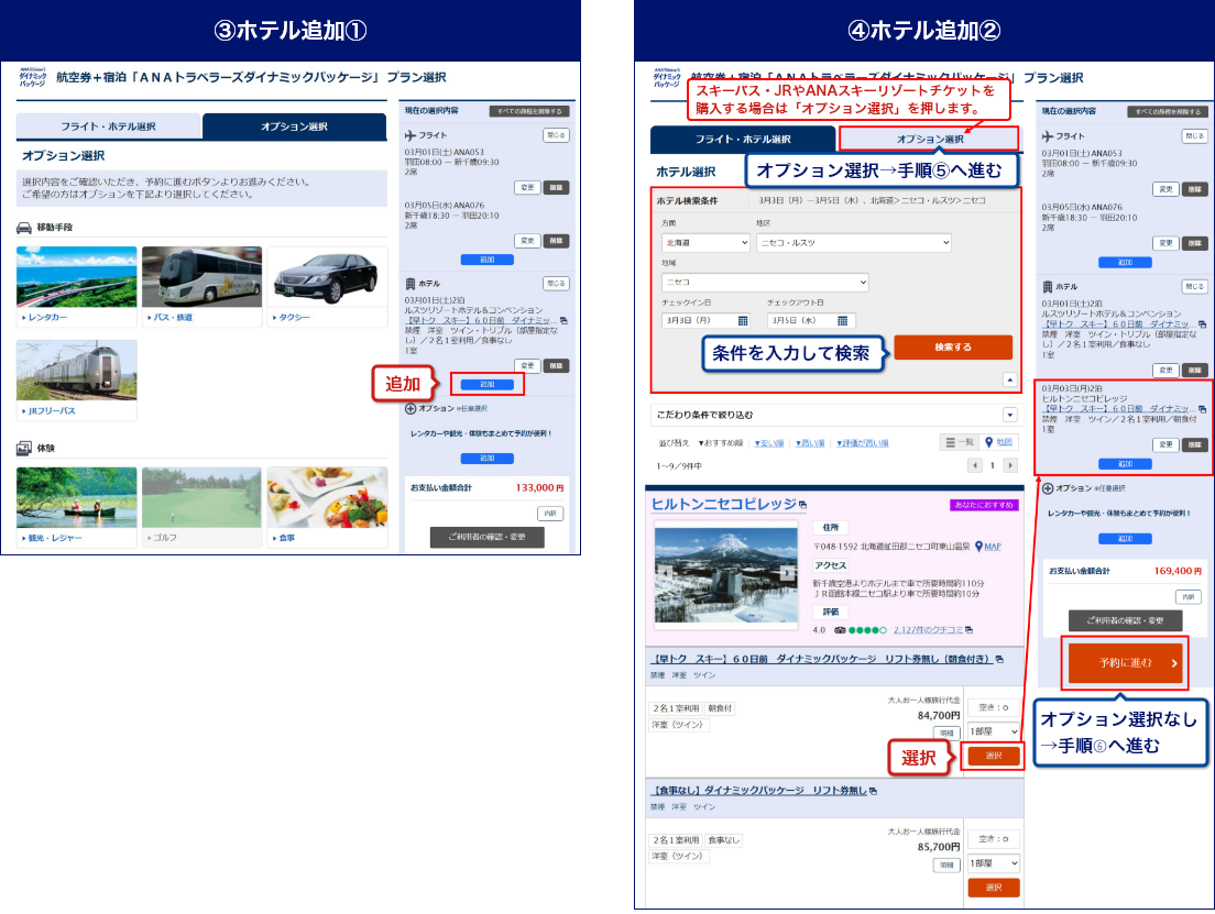 1泊ずつ異なる宿泊施設を予約したり、スキーバス・ANAスキーリゾートチケットを一緒に予約することも可能です。