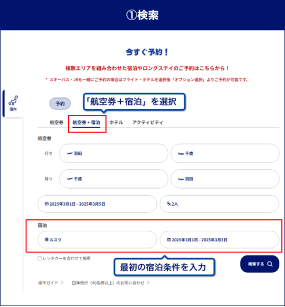 「航空券+宿泊」を選択し、航空券の利用区間、搭乗日(往路/復路)、人数、宿泊地、宿泊日を入力して右下の「検索する」ボタンを押します。