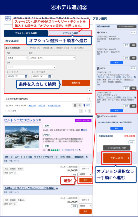 スキーバス・JRやANAスキーリゾートチケットを購入する場合は「オプション選択」を押します。→手順⑤へ