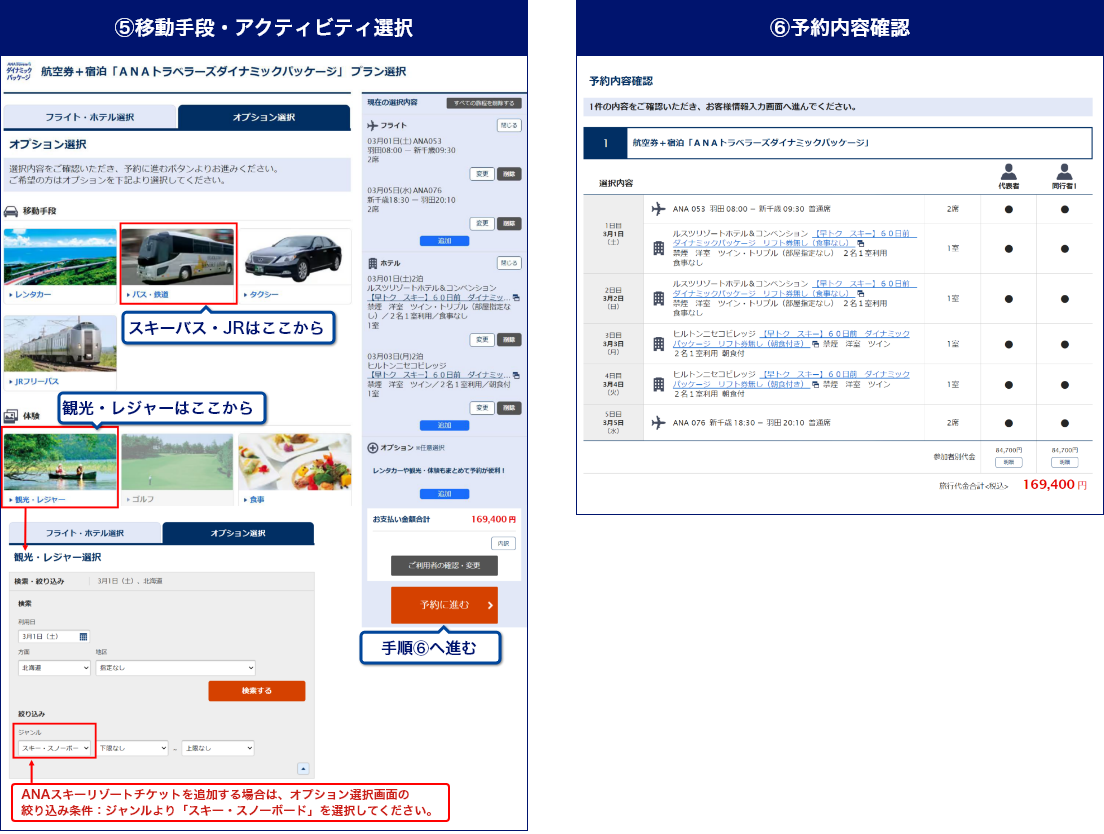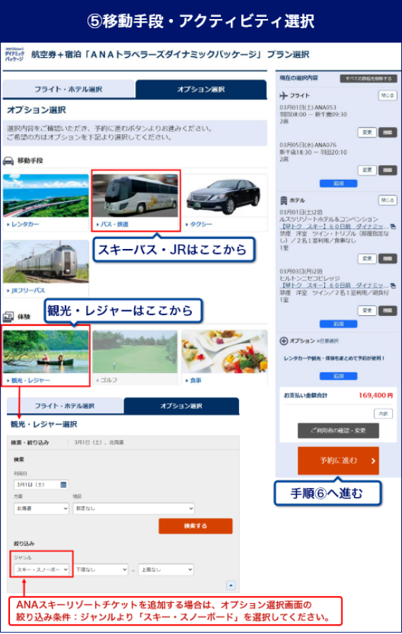 スキーバス・JRは「バス・鉄道」、ANAスキーリゾートチケットは「観光・レジャー」から、それぞれお手続きください。