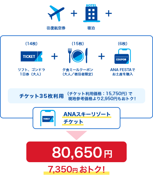 リフト・ゴンドラ券はもちろん、スキー&スノーボードレンタルやウェアレンタルがおトクに使える電子チケットです。あまっても新千歳空港内のANAFESTAで利用できるので、お土産にも使えて便利!