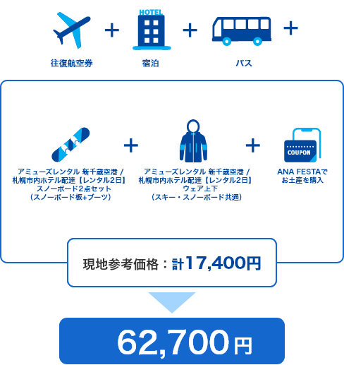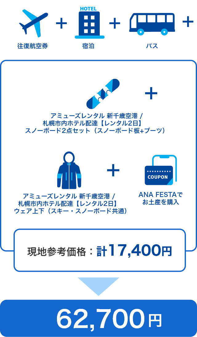 航空券・宿泊に加えて、札幌市内からスキーリゾートの往復スキーバスも一緒に予約できるプランをご用意