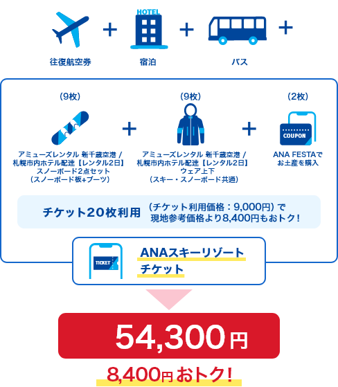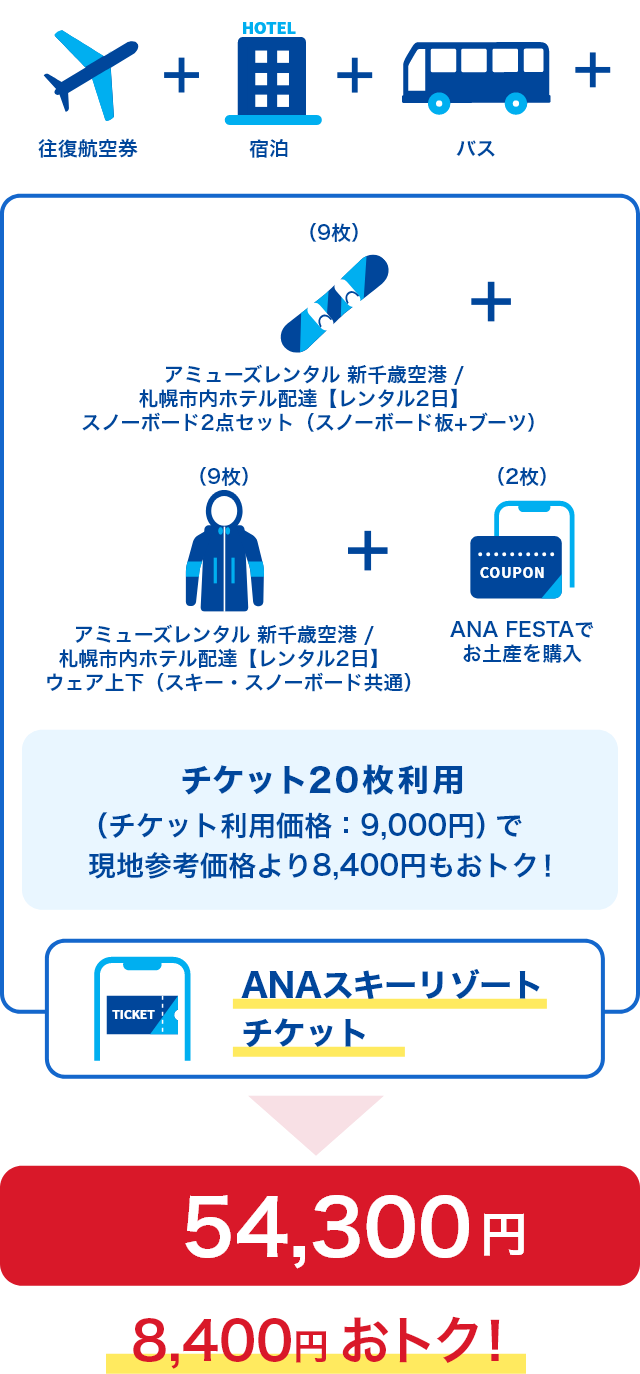 リフト・ゴンドラ券はもちろん、スキー&スノーボードレンタルやウェアレンタルがおトクに使える電子チケットです。あまっても新千歳空港内のANAFESTAで利用できるので、お土産にも使えて便利!