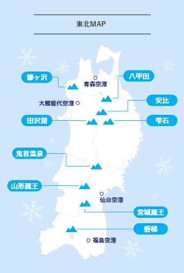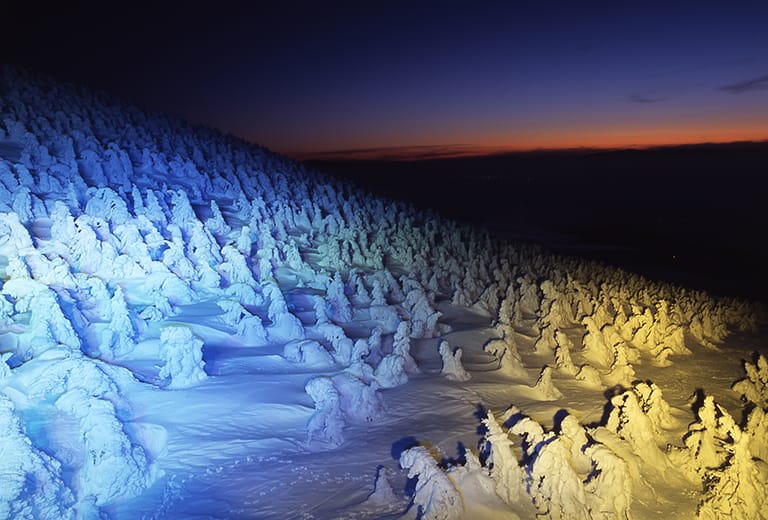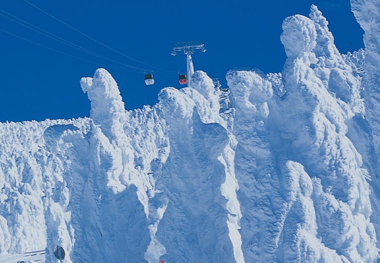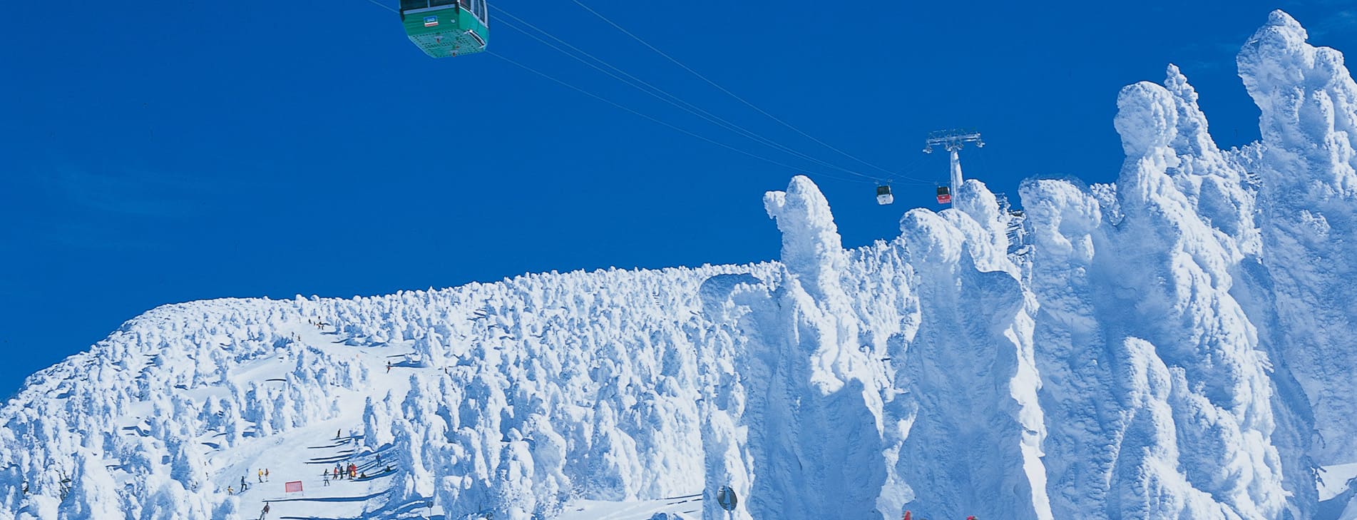 雪質抜群のパウダースノーで楽しめる変化に富んだゲレンデ・コース、そして夜は幻想的な雰囲気に包まれる樹氷ライトアップ。蔵王連峰を見渡す大パノラマを楽しみ、一日中遊びを満喫!