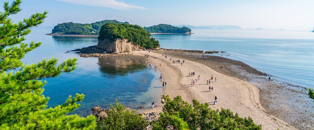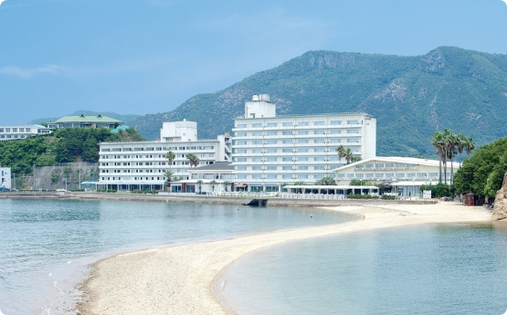 瀬戸内海の景観に恵まれた全室オーシャンビューのホテル。窓からは四国・屋島や、一日2回の干潮時に現れ、島と島を砂浜の道でつなぎ歩いて渡ることができるロマンチックなスポット「エンジェルロード」を眺めることができます。