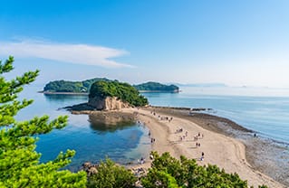 瀬戸内海の景観に恵まれた全室オーシャンビューのホテル。窓からは四国・屋島や、一日2回の干潮時に現れ、島と島を砂浜の道でつなぎ歩いて渡ることができるロマンチックなスポット「エンジェルロード」を眺めることができます。