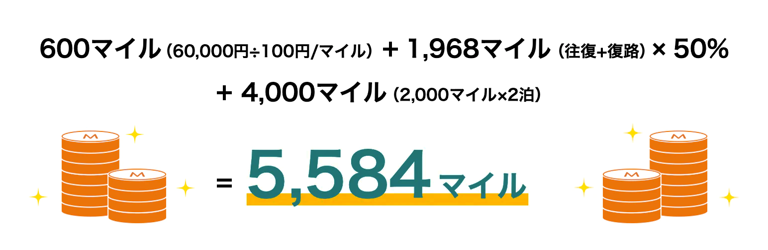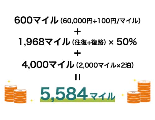 [600マイル(60,000円÷100円/マイル]+[1,968マイル(往復+復路)× 50% ]+[4,000マイル(2000マイル×2泊)]= 5,584マイル