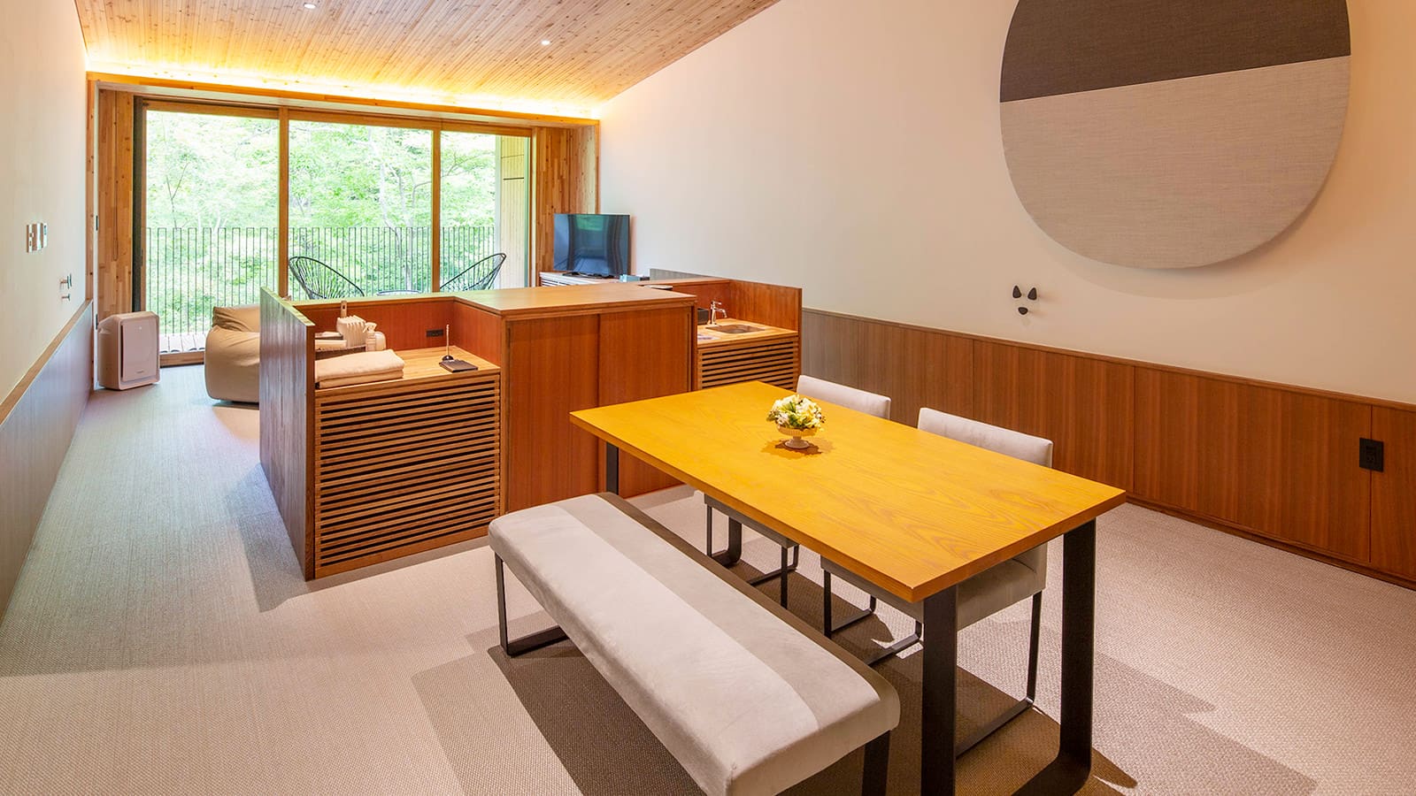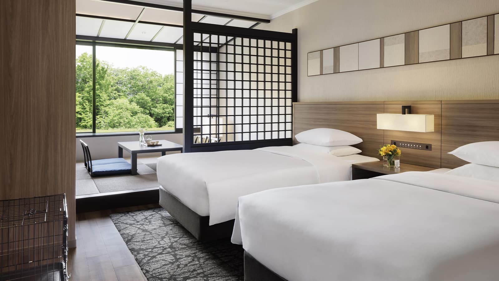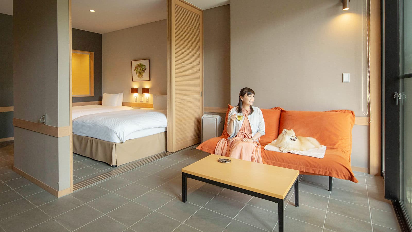 伊豆の森で愛犬と過ごす休日に、気軽にご利用いただける31.2平方メートルの洋室タイプの客室と、靴を脱いでゆっくりとおくつろぎいただける和室リビングと、ベッドスペースを備えた41.2平方メートルの和洋室タイプの客室をご用意。木のマテリアルをちりばめた温かみのある空間で憩いのひとときをお過ごしください。