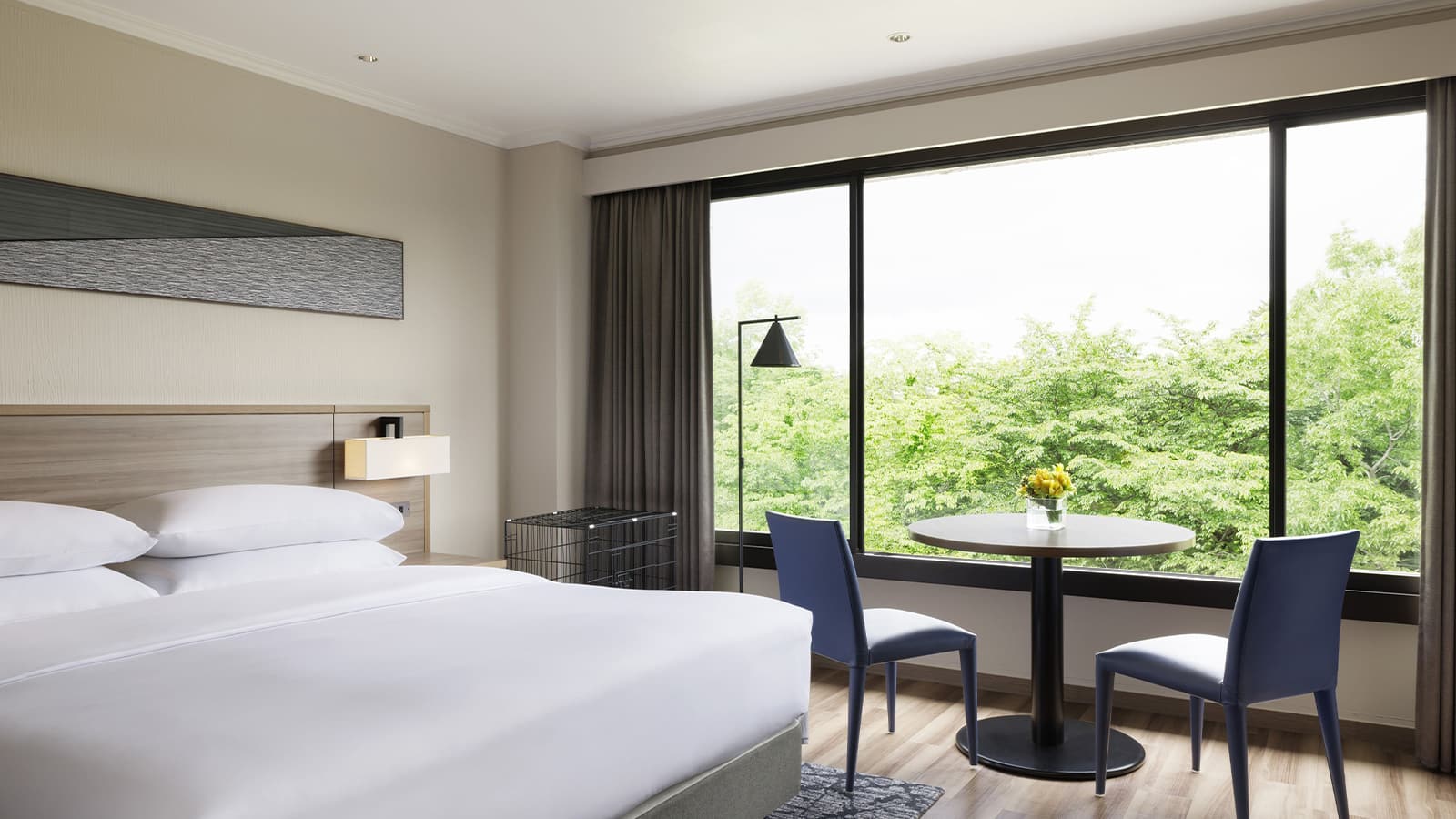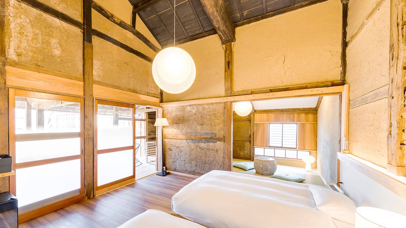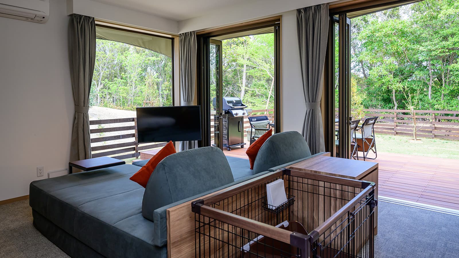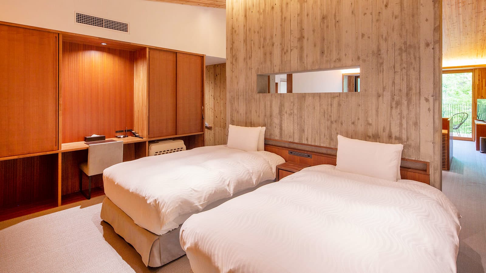 伊豆の森で愛犬と過ごす休日に、気軽にご利用いただける31.2平方メートルの洋室タイプの客室と、靴を脱いでゆっくりとおくつろぎいただける和室リビングと、ベッドスペースを備えた41.2平方メートルの和洋室タイプの客室をご用意。木のマテリアルをちりばめた温かみのある空間で憩いのひとときをお過ごしください。