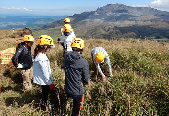 ガイドと共に行う登山道整備体験。国立公園内に位置する阿蘇五岳に登り、浸食され、歩きにくくなった登山道を、石や砂利などを用いた「近自然工法」により整備することで、自然との共生やSDGsについて学びます。