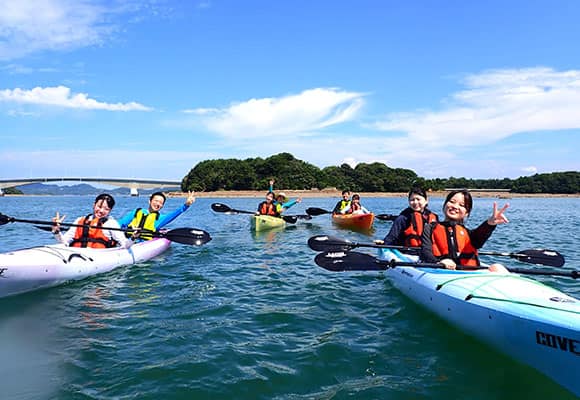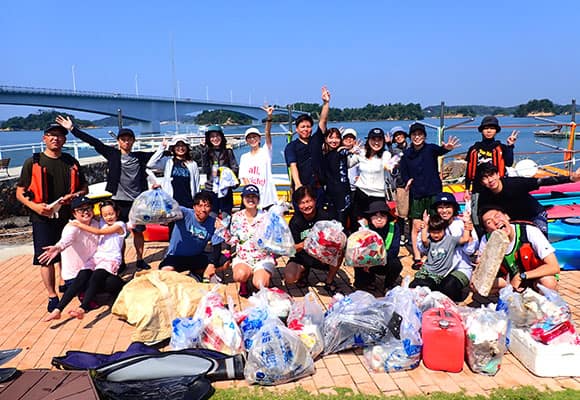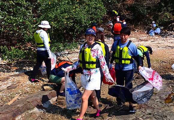 シーカヤックを漕ぎ、天草の美しい海をツーリングし、無人島へと移動します。無人島で、漂着したペットボトルなどの海洋ゴミを拾います。拾ったゴミはシーカヤックに乗せ、持ち帰ります。