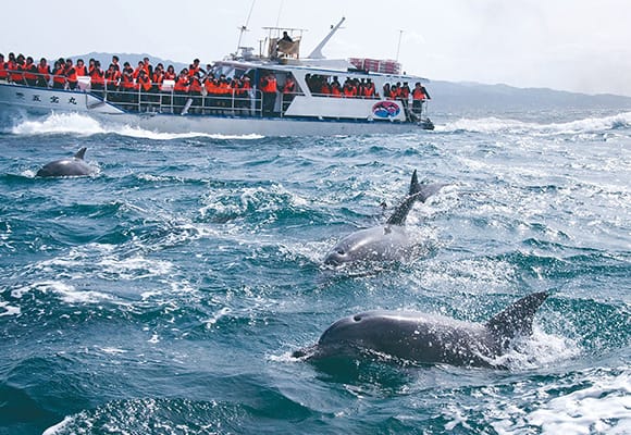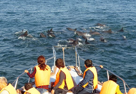 天草の海には約200頭のイルカが生息。五和町の港から15分で野生のイルカに出会うことができます。イルカはとても人懐っこく、船を怖がらず近づいてきます。すぐそばまでやってきて愛嬌をふりまくイルカを眺めて、心を癒されてみませんか。