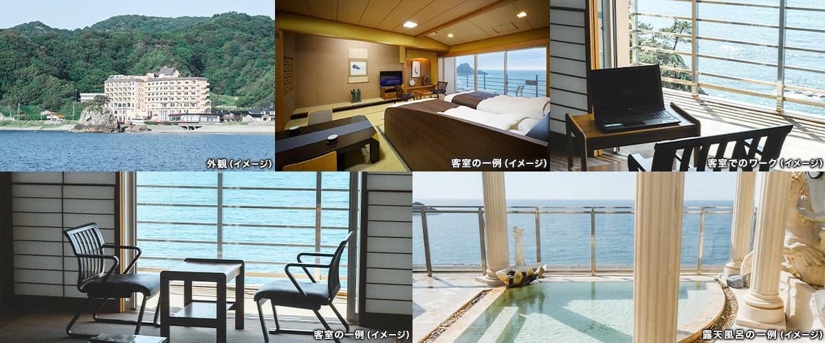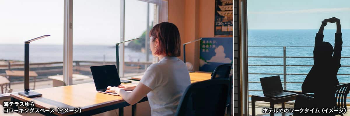 宿泊先の由良温泉 八乙女、「釣り体験」の拠点となる海テラスゆらではWIFI環境も完備しており、海を見ながらの「ワークタイム」が叶います。
