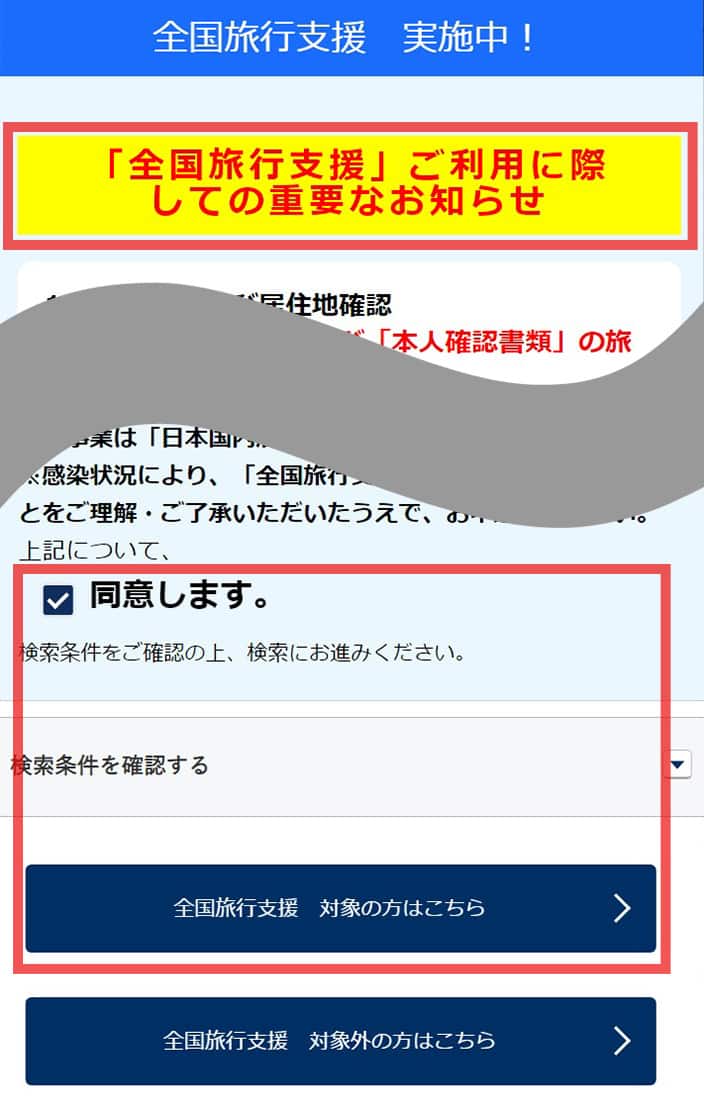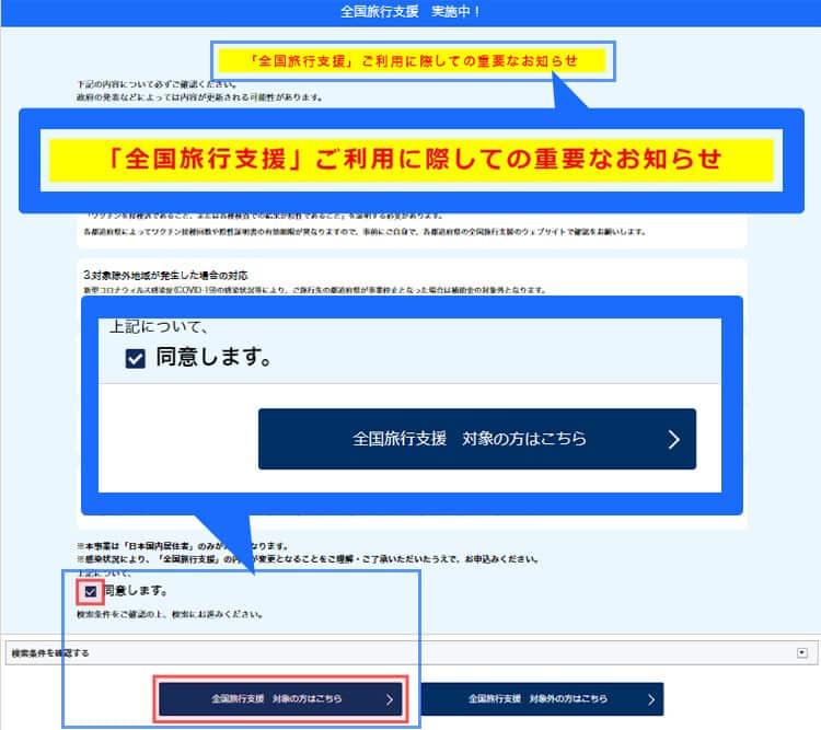 必ずご確認の上、「同意します」にチェックをして「全国旅行支援 対象の方はこちら」から進んでください。