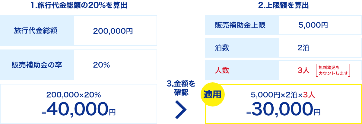 上限額を算出:お一人様1泊あたりの販売補助金上限に、泊数と人数を乗じて当該旅行の上限を算出します。(この場合、無料幼児も「人数」にカウントします。)