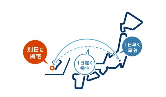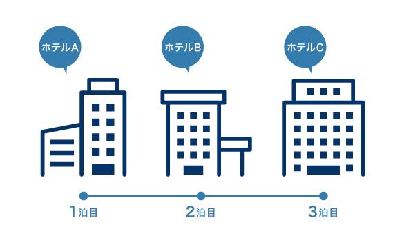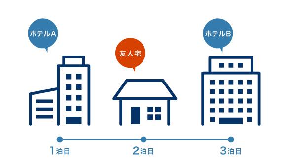 旅行期間中、1泊ずつ異なるホテルに宿泊する場合や、実家や友人宅に宿泊することも可能