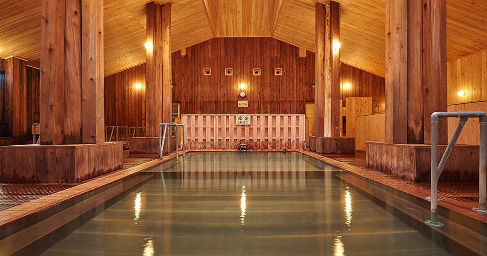 総ヒバ造りの大浴場「ヒバ千人風呂」は160畳もの浴室に熱の湯・冷の湯・四分六分の湯・湯滝など4つの異なる源泉があります。