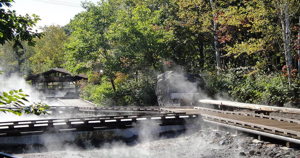 温泉の源泉となる硫黄山の火山活動が近くにあり、温泉の川が街中に流れている。