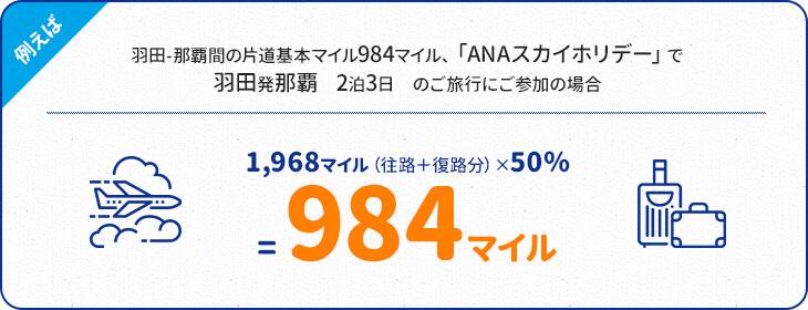 羽田~那覇間の片道基本マイル984マイル、「ダイナミックパッケージ」で羽田発那覇2泊3日のツアーにご参加の場合。