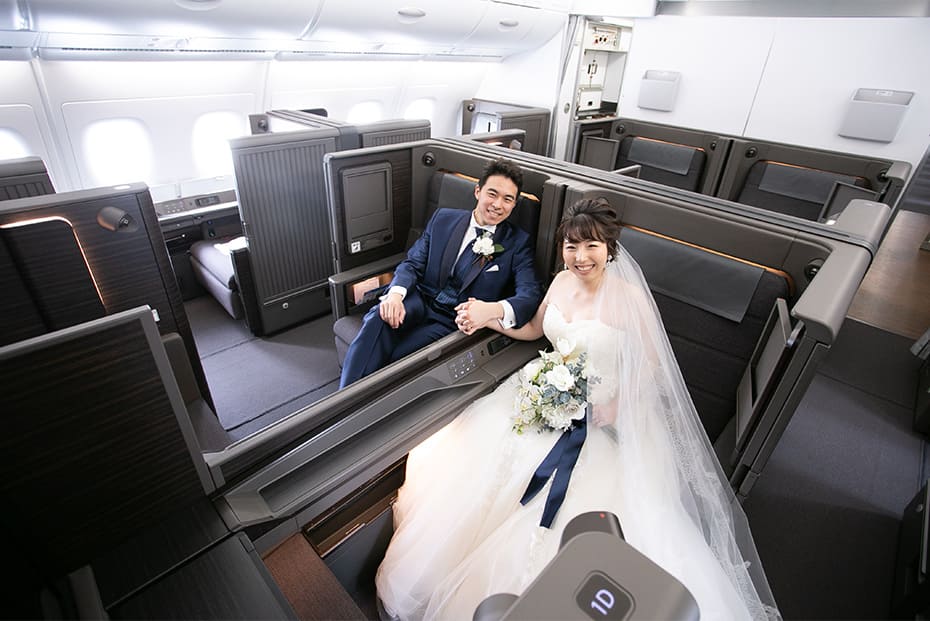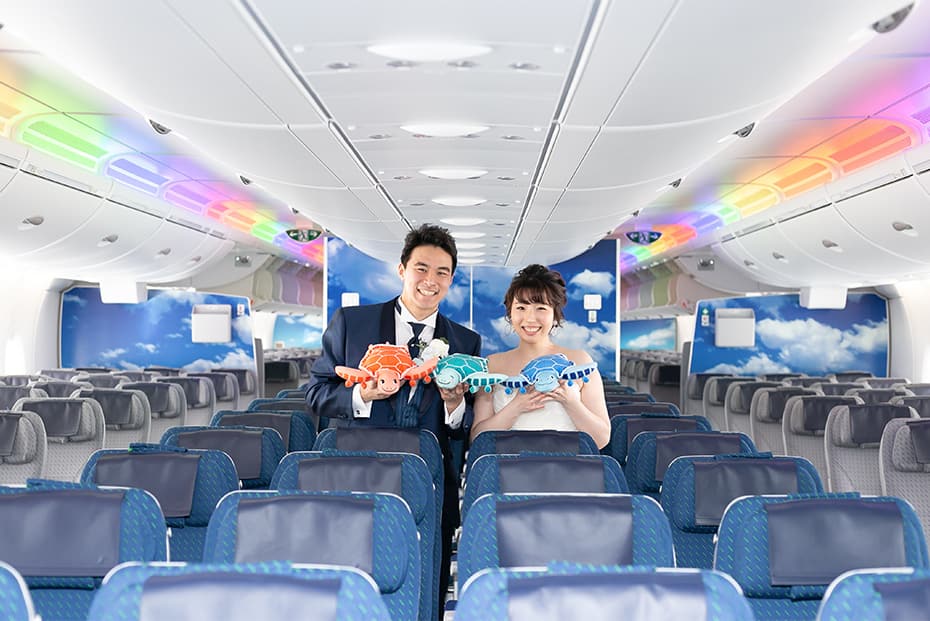 航空機機側で「FLYING HONU」をバックにダイナミックな撮影が可能!機内では憧れのファーストクラス、ドレスが映える階段、ハワイの虹を催した天井ライト、ハワイをイメージした「空」「海」のグラフィックなど、他の機体にはない特別なフォトスポットがたくさん!貸切ができるのは今だけ!