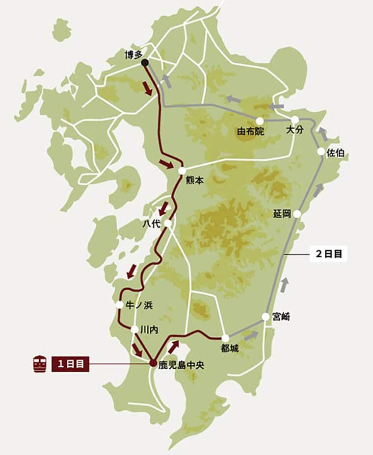 牛ノ浜駅(16:48 頃着/18:05 頃発) 川内駅(19:05 頃着/19:11 頃発)鹿児島中央駅(21:20 頃着/22:17 頃発) 宿泊列車泊 |