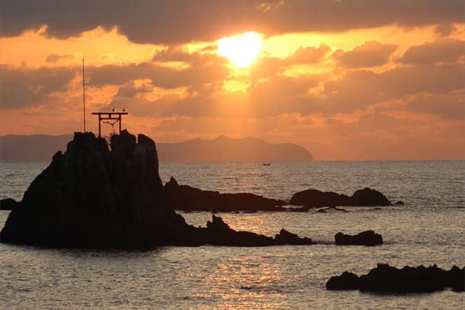 肥薩おれんじ鉄道「牛ノ浜駅」は鹿児島県阿久根市にある、荒波に洗われた岩々と、起伏の激しいダイナミックな海を望む海沿いの小さな駅です。一帯は鹿児島県立自然公園となっている「牛之浜景勝地」が広がる名勝。ななつ星では最も美しいと言われる夕暮れ時の時間帯に停車します。訪れる季節や時間、そして空模様で変化する、その時だけの夕映えの景色を是非記憶に刻んでいただければと思います。