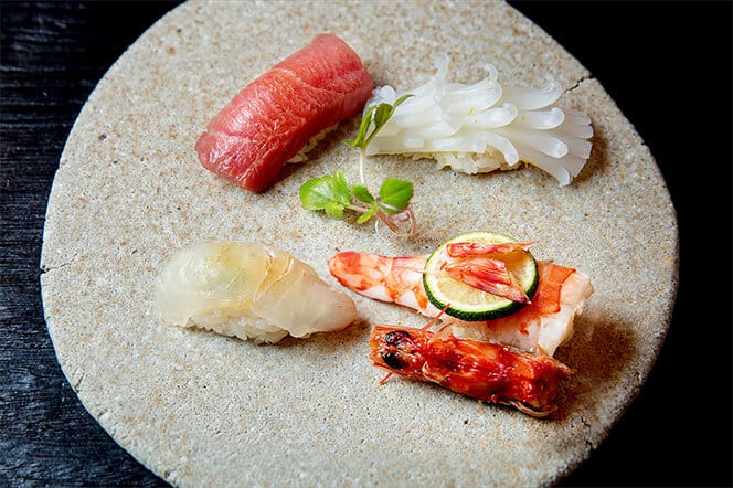 「ななつ星」の車内では、玄海灘をはじめとする近海物の魚介類と、磨きぬかれた料理人の腕による握りたてのお鮨で、贅沢な時間と空間をご提供いたします。
