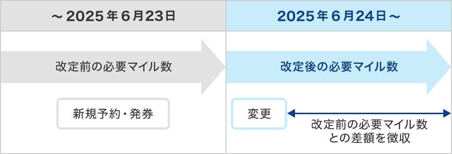 上記適用開始日以前にご予約いただいた航空券を適用開始後に変更した場合、変更後の必要マイル数・規則が適用となります。詳細は改定後の必要マイル数適用時期についてをご確認ください。