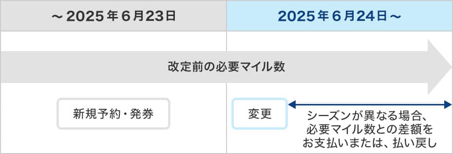 改定前または改定後の必要マイル数のどちらが適用されるかは、新規ご予約・発券、ご予約後の変更、空席待ちの時期によって異なりますので、以下よりご確認ください。