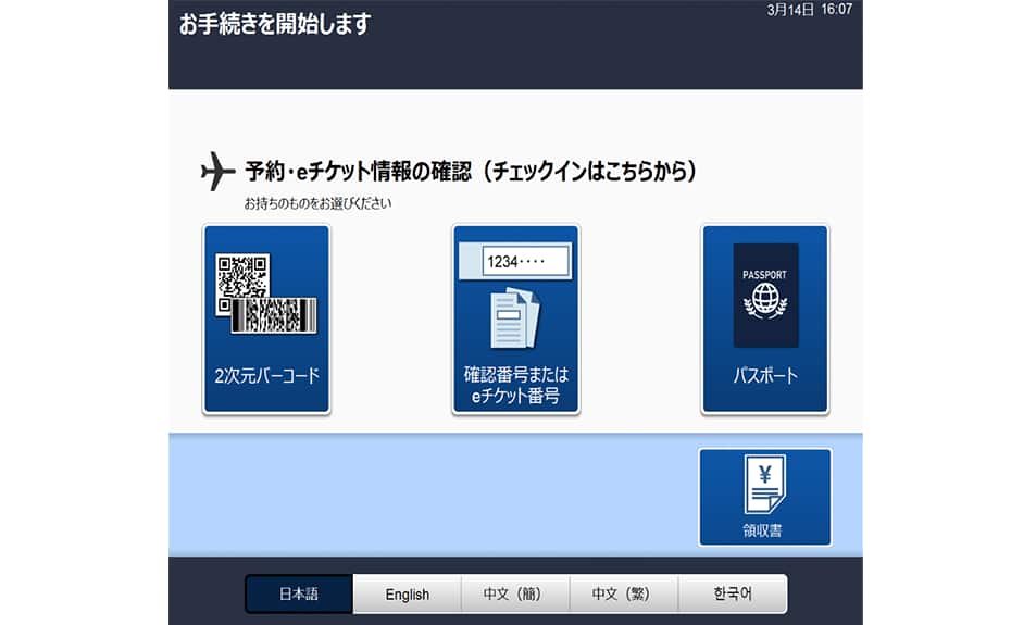 2次元バーコード、国際航空券番号、パスポート、いずれかお持ちのものをお選びください。