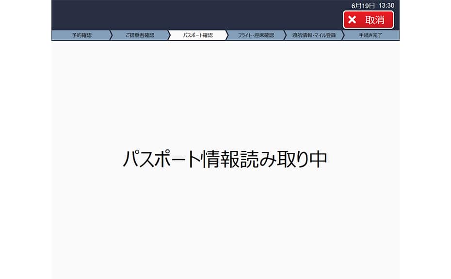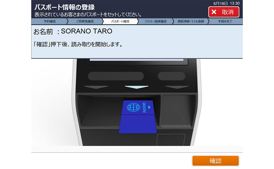 画面上部に表示されたお客様のパスポートを、画面の表示に従って読み取り口に置いてください。「確認」を押すと、読み取りが始まります。