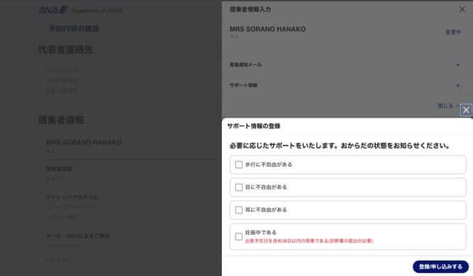 ANAウェブサイトでは、予約時または予約後に、搭乗者情報の入力画面でおからだの状態をご登録いただけます。