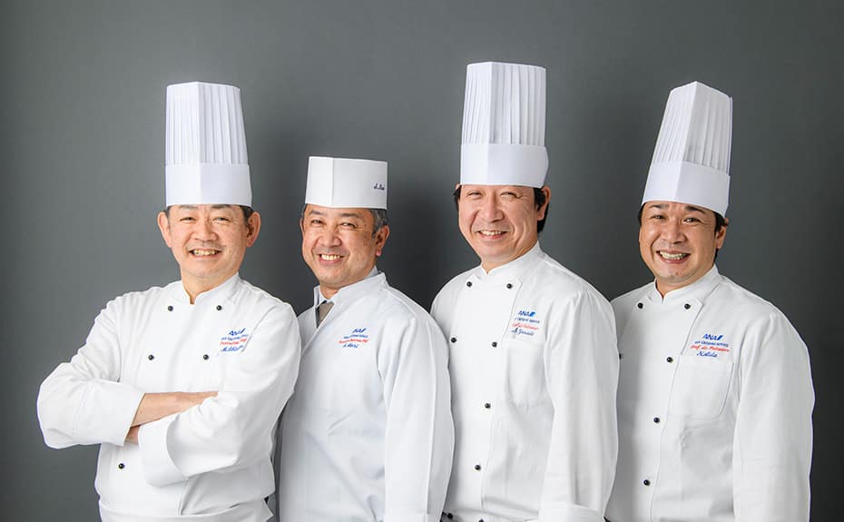 ANAシェフ一同(左からANA総料理長:清水 誠 和食料理長:森 誠剛 洋食料理長:山田 真吾 ペストリーシェフ:相田 紀昭)