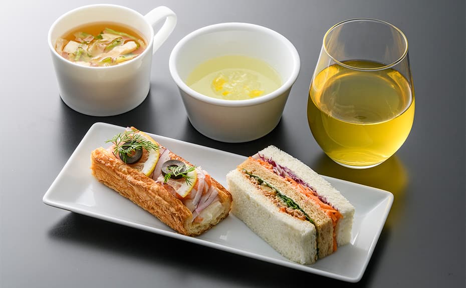 国内線の機内食は出発時間に合わせ、朝食ではサンドウィッチをメインとしたお食事、昼食・夕食には日本各地の旬の食材をちりばめた和洋折衷のお食事をご提供しております。