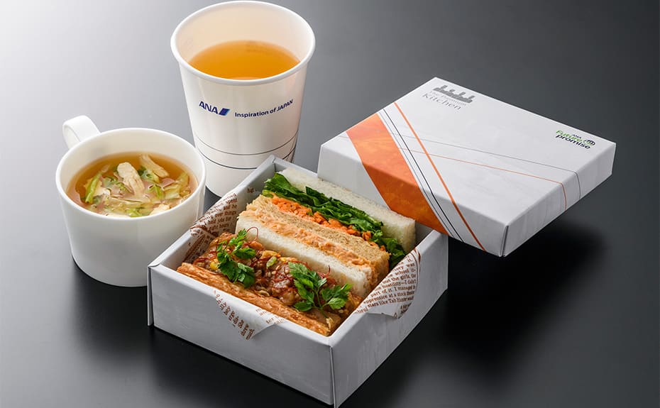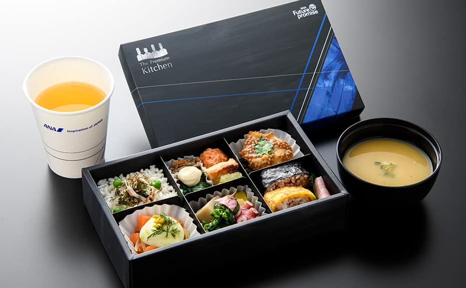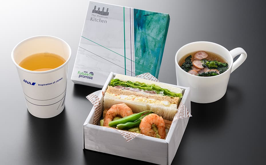 ANA Future Promiseの一環として、プレミアムクラスのお食事では、再利用可能な食器、使い捨ての容器やアイテムに関しては環境に配慮した素材で出来た製品を使用しています。