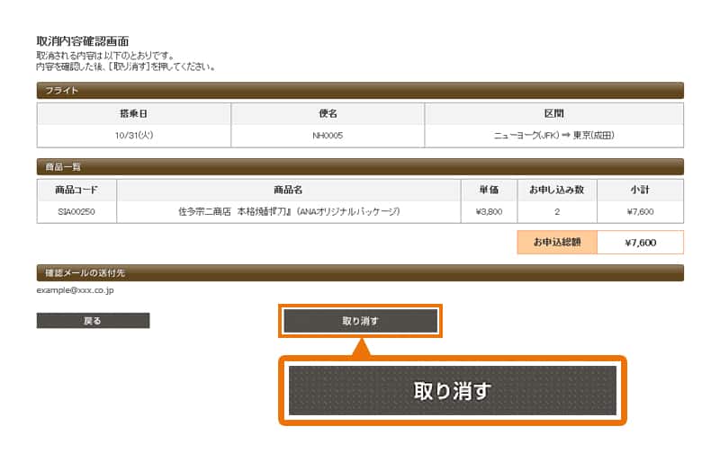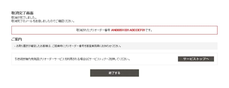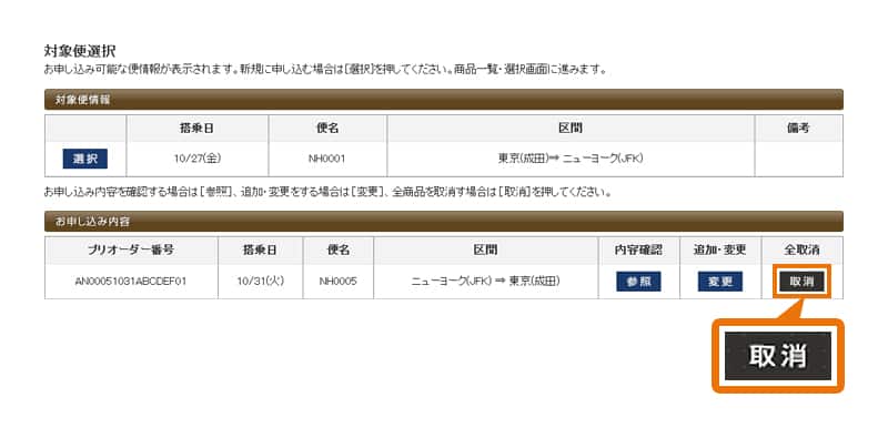 該当のフライトでのプリオーダーを全て取り消したい場合は「お申し込み内容」欄の[取消]ボタンを選択してください。