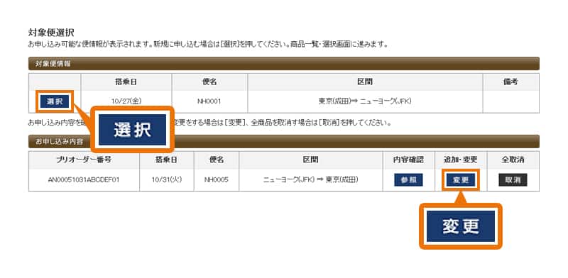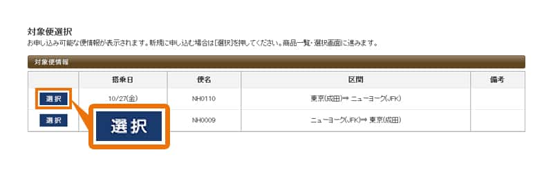 「対象便選択」内に、お申し込みが可能なフライト情報が表示されます。 新規に申し込む場合は[選択]ボタンを押してください。