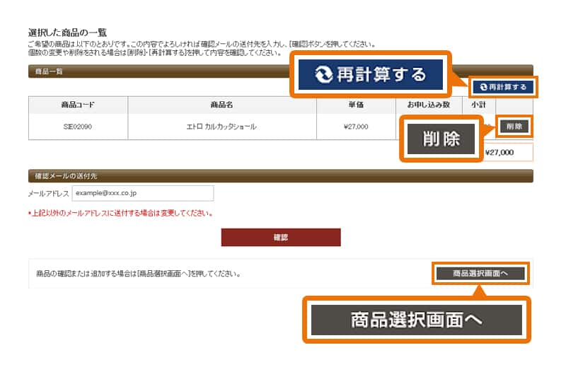 個数を変更する場合は、個数を選択後、[再計算をする]ボタンを押してください。 別の商品に変更する場合は、[削除]ボタンを押した後、[商品選択画面へ]ボタンを押してください。「商品選択画面」に戻ります。