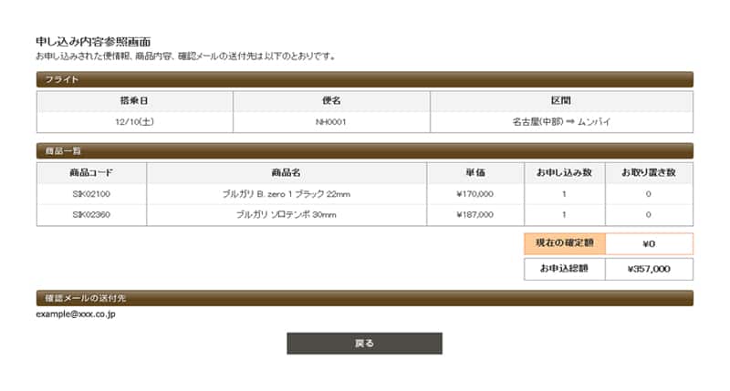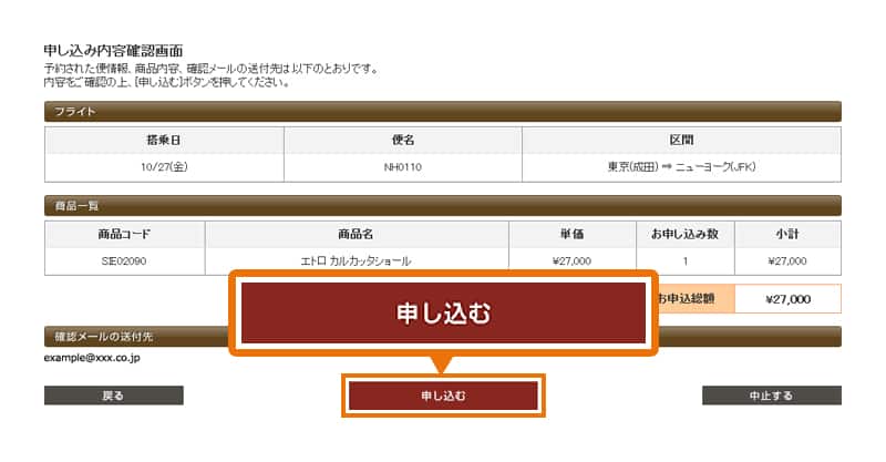 申し込みされたフライト情報・商品内容・メールアドレスをご確認ください。こちらでよろしければ[申し込む]ボタンを押してください。