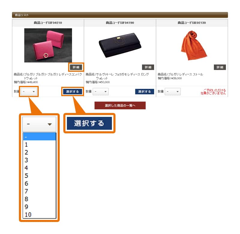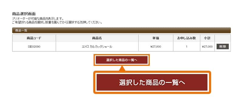 ご希望の商品カテゴリボタンを選択してください。 プリオーダーが可能な商品が表示されます。 ご希望の商品の[詳細]ボタンを選択すると「商品の詳細画面」をご覧いただけます。 ご希望の商品下の「数量」を確定してから、[選択する]ボタンを押してください。