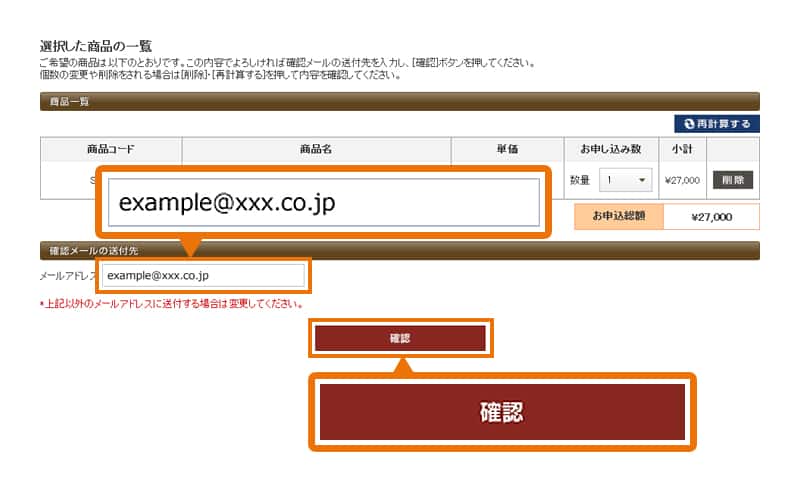 ご希望の商品内容をご確認ください。こちらでよろしければ、「確認メールの送付先」にメールアドレスを入力し、[確認]ボタンを押してください。