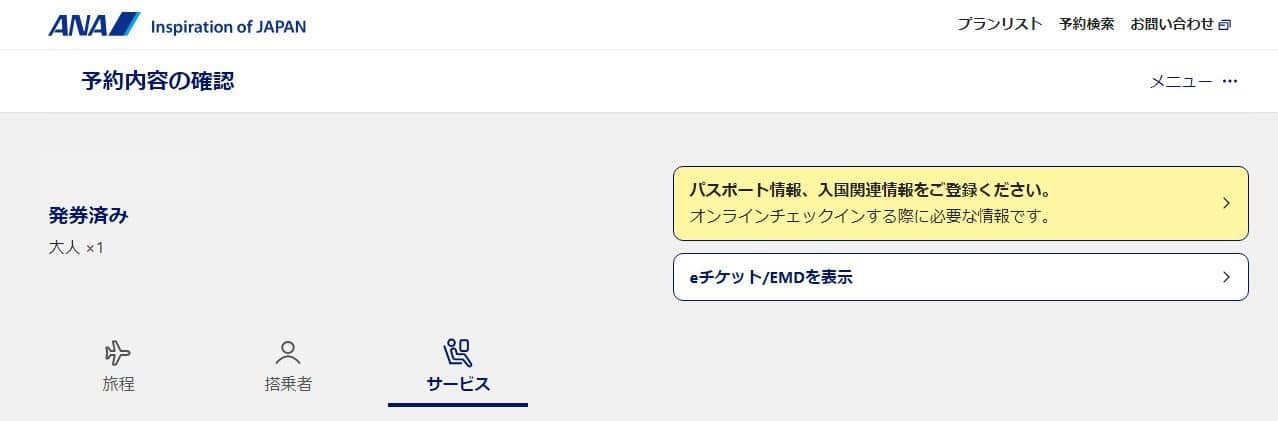 予約詳細(機内食が「申し込み済み」と表示される)を確認する。