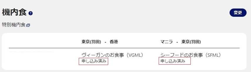 お申し込み済の特別機内食はフライトの予約変更後、お申し込みいただいていたサービスが取り消される場合がございます。変更完了後に登録状況を必ずご確認ください。