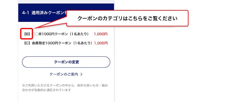 最もお得な組み合わせが自動で適用されますが、クーポンの変更も可能です。クーポンの組み合わせは【A】【B】【C】をそれぞれ1カテゴリずつ、合計3枚の組み合わせが可能です。